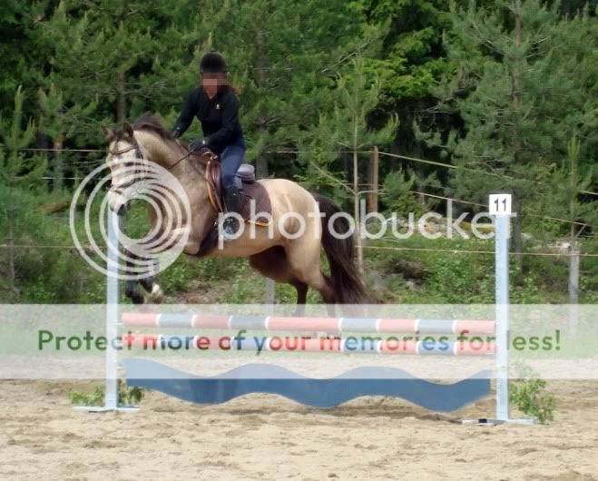 Seuraava suuri haaste oli vesieste. Sulo vilkuili vesimattoa jo kauempaa ja kyttäsi sitä ravaillessamme esteen ohi. En kuitenkaan lannistunut, vaan nostin laukan ja päättäväisenä ohjasin orin esteelle. Jätkä löi kuitenkin jarrun pohjaan jo hyvissä ajoin ennen estettä ja Viona otti yläpuomin pois, jolloin esteelle jäi korkeutta about 60cm. Toisella yrityksellä yli mentiin epämääräisessä laukassa varsin kömpelöllä loikalla, mutta kun Viona nosti puomin takaisin paikoilleen, rupesi Sulonkin kintut nousemaan. Kolmannella kertaa mentiin nimittäin yli jo kyttäilemättä, tiikerimäisellä loikalla.