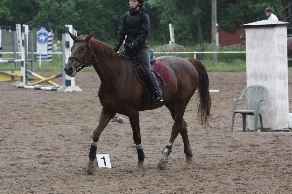 Syna oli ryhmän hevosista rauhallisin, mutta myös "laiskin". Tamma olisi mieluiten hölkytellyt korvat lurpassa sinne minne piti, mutta pontevuutta saatiin hakea askeleisiin heti alussa. Siirtymisiin se ei meinannut reagoida nopeasti ei sitten millään ja sitä sai sekä pidättää paljon, että pyytää eteen paljon. Loppua kohden hevosen reagointi kuitenkin parani ja meno näytti ihan mallikkaalta. Tältä ratsukolta nähtiin myös tämän ryhmnän paras ja suorin peruutus. Puomeilla tamma ei olisi halunnut nostella jalkojaan, mutta jahka saatiin vauhtia tammaan niin johan loppui puomien kolistelut. Tammakin taisi vähän herätä sitten tässä vaihteessa, koska askeleita lyhentäessä sitten taas ei meinannut löytyä jarruja enää...